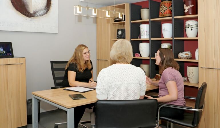 In unserem Beratungsraum können wir in Ruhe miteinander sprechen und alles rund um die Trauerfeier und Bestattung gemeinsam planen. Hier geben wir Ihnen auch einen Überblick über unsere Särge und Urnen. Viele Modelle können Sie sich bei uns direkt in natura anschauen. Einer aus dem Team Schweitzer ist immer ansprechbar, denn wir stehen Trauernden an 365 Tagen rund um die Uhr telefonisch zur Verfügung.